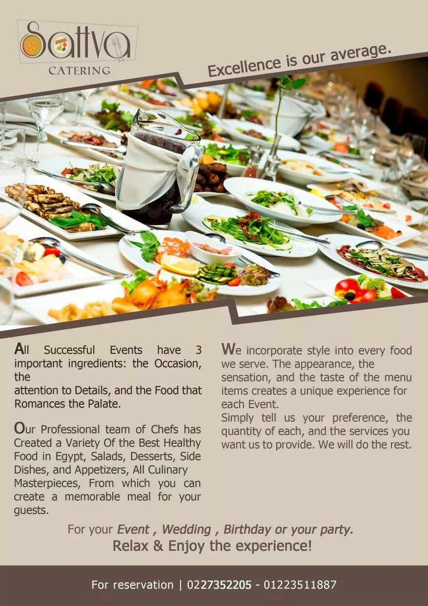 أنواع عديدة من المقبلات الباردة كالحمص والمتبل والبابا غنوج وورق العنب والسلطات المختلفة كالتبولة وسلطة الخضار والزبادي والفتوش والمقبلات الساخنة كالكبة المقلية المحشية باللحمة والمكسرات بمذاق وطعم لا يقاوم والبطاطا المقلية وأصناف من المعجنات متنوعة كالبيتزا والفطائر والسمبوسك المحشي بالجبنة واللحمة والخضار.